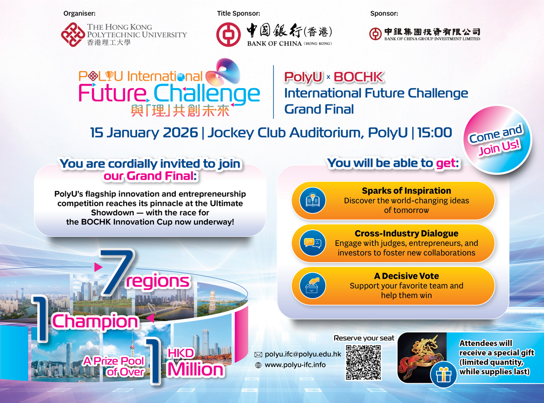 On January 15, 2026, Hong Kong Polytechnic University will host the PolyU x BOCHK International Future Challenge Grand Final — where the top innovators go head-to-head for glory!