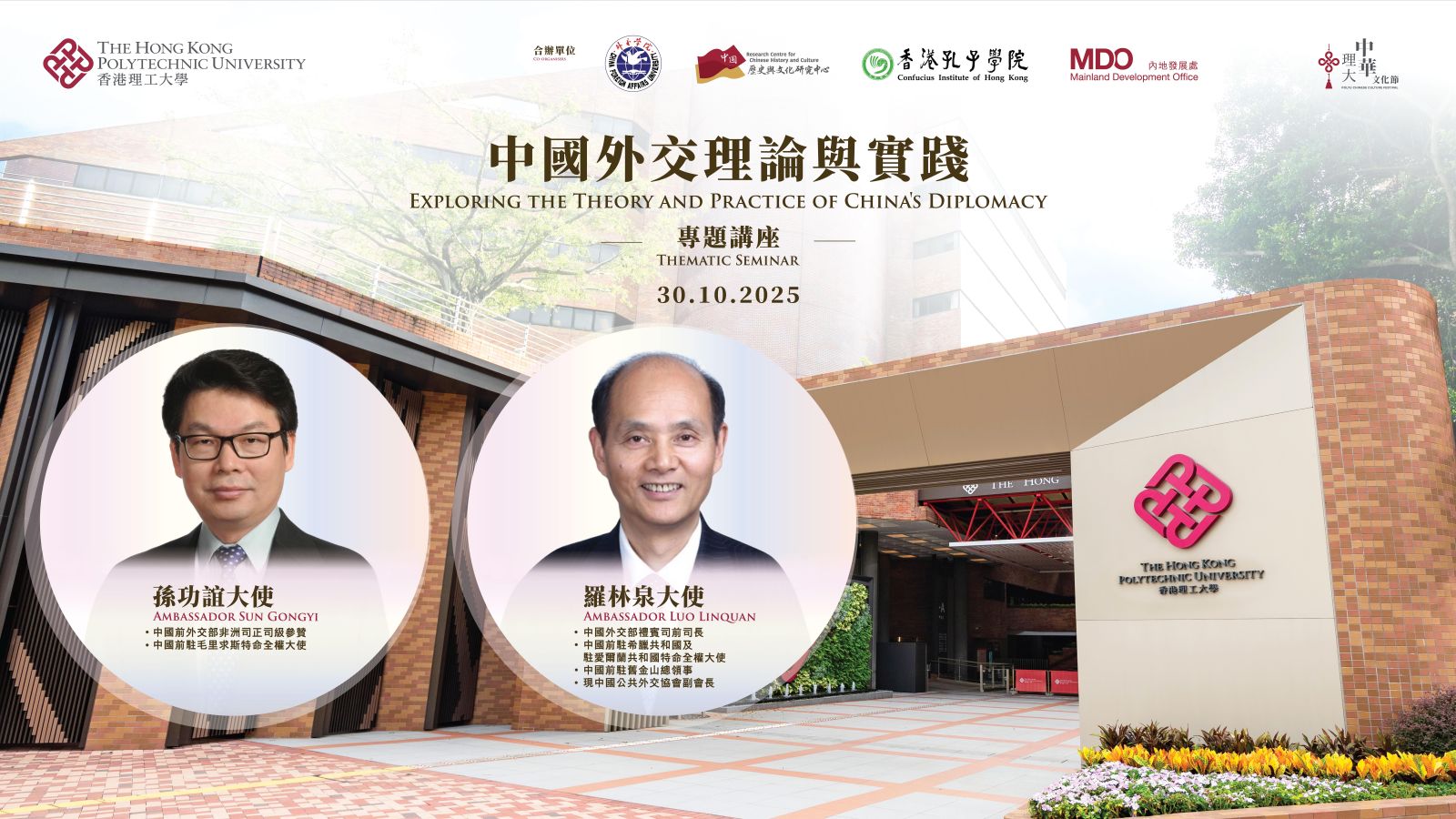 Dear Colleagues & Students As China assumes an increasingly important role on the global stage, its foreign policy has attracted growing international attention. The Confucius Institute of Hong Kong, the Research Centre for Chinese History and Culture, and the Mainland Development Office of PolyU will jointly host a thematic seminar titled “Exploring the Theory and Practice in China's Diplomacy” on 30 October 2025 (Thursday), 4.30 – 6.30pm at Chiang Chen Studio Theatre on campus. This distinguished event will feature insightful lectures by two eminent Ambassadors from the Ministry of Foreign Affairs of the People’s Republic of China. They will share their expertise in diplomacy and foreign affairs, their personal diplomatic experiences, as well as perspectives on the theory and practice of China-Africa diplomacy. This seminar is one of the highlight events of the PolyU Chinese Culture Festival. Since last year, PolyU has actively promoted Chinese culture through a variety of artistic themes and enriching activities, fostering a sense of national pride among staff, students and the wider community. This year’s festival commenced in July, and the thematic seminar aims to deepen understanding of China’s foreign policy and international affairs, as well as to explore the challenges and opportunities the country faces in the field of diplomacy. The topics and speakers are as follows: