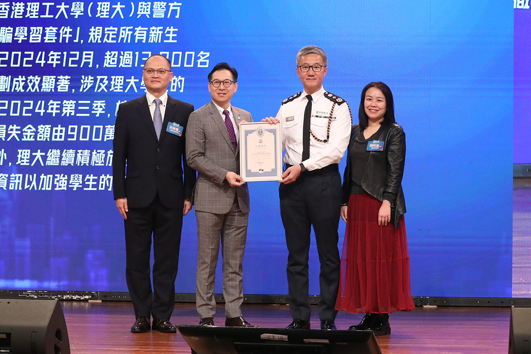 We are thrilled to announce that PolyU has been honoured with the "Good Organisation Award" at the “Good Citizen Award Presentation Ceremony 2024” held by the Hong Kong Police Force (HKPF) on 23 February 2025. The Ceremony recognised 80 citizens and seven organisations for their contributions to crime prevention and public safety. In collaboration with HKPF, PolyU launched the "Online Anti-deception Learning Kit" in 2024, requiring all new students to complete the kit before enrolment. As of December 2024, over 13,000 students had participated, leading to a significant reduction in telephone deception cases targeting PolyU students, particularly among non-local students.
