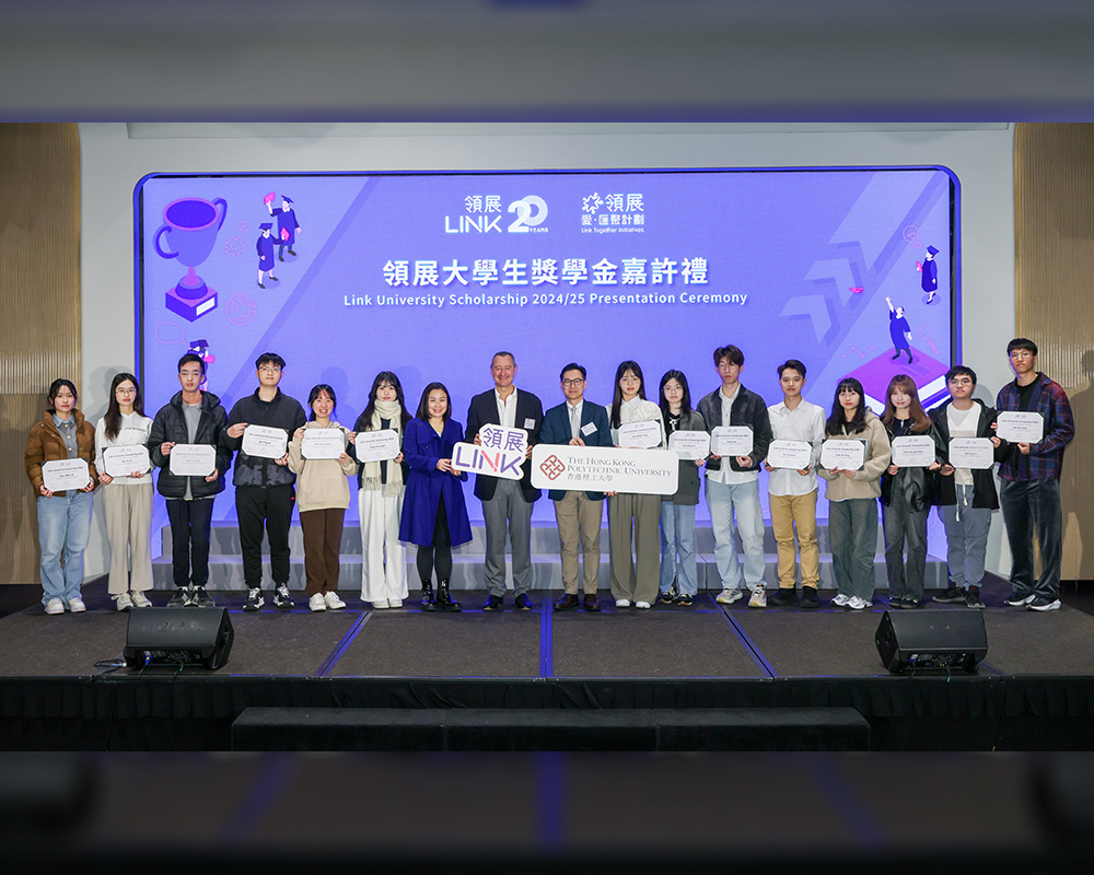 Fourteen PolyU first-generation university entrants were awarded a Link University Scholarship in 2024/25. The Scholarships recognise outstanding performance in academic pursuits and community service, encouraging students to pursue their dreams. The outstanding PolyU students were presented with scholarship certificates at the Link University Scholarship Presentation Ceremony on 8 March.